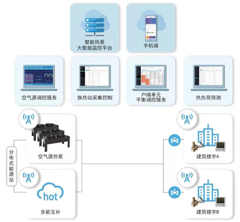 該系統包括基于物聯網技術的智慧空氣源熱泵分布式新能源站、HDCS能源站控制系統、末端均溫調控系統、熱負荷預測系統、智慧供熱管理平臺。該系統解決方案可以實現源-網-站-端”全過程覆蓋管理,全程在線管理和優化調控。
